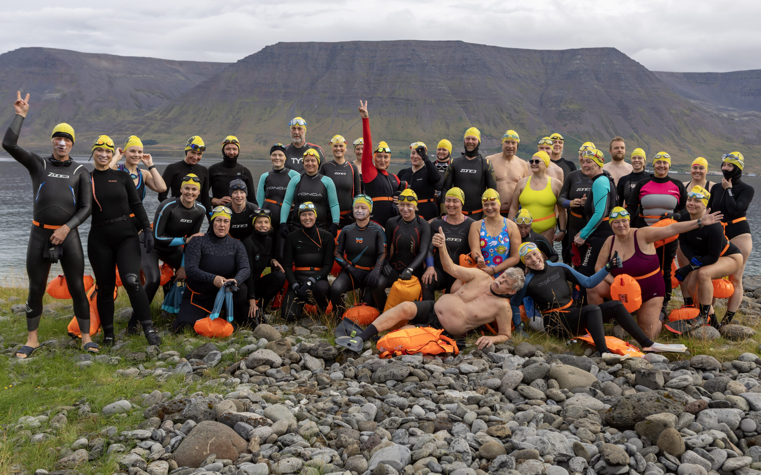 Að þessu sinni voru það 39 ofurkappar sem lögðu af stað með góðar óskir og kapp í kinn, sumir í einföldum sundklæðnaði, aðrir gallaðir upp fyrir haus og út í fingur og tær en þar sem ekki er um að ræða keppni eru öll hjálpartæki svo sem eins og froskalappir og gallar leyfilegir en fjarri því að allir nýti sér það. En hjálpsemi er í hávegum höfð og ef þarf aðstoða næsta syndara í land, er oft einhver í nálægð sem hysjar fólk í land.